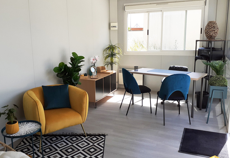 Le promoteur souhaitait aménager son espace de vente pour… la semaine suivante ! L’objectif étant de créer un espace bureau et un coin détente, Adeline a ainsi proposé 2 ambiances de couleurs différentes : bleu canard et jaune.